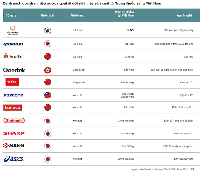 Những công ty đang di dời nhà máy từ Trung Quốc sang Việt Nam, gồm: Goertek (HongKong) về sản suất tai nghe và linh kiện điện thoại sẽ di dời sang Bắc Ninh; TLC (Trung Quốc) về điện tử, tivi sẽ di dời sang Bình Dương.