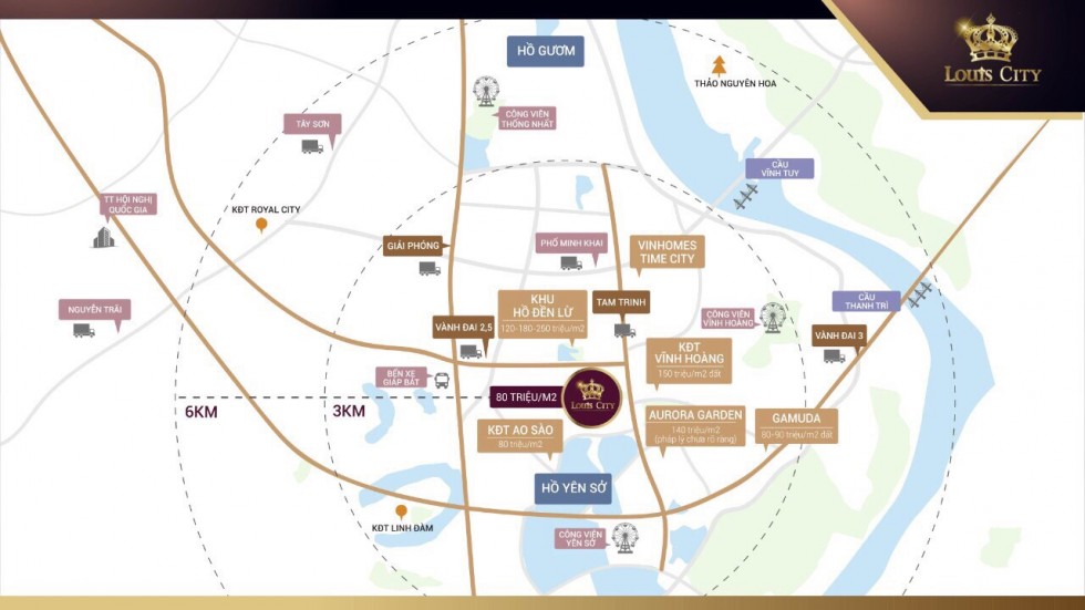 Theo khảo sát, giá đất khu vực các KĐT lân cận như: Khu Hồ Đền Lừ 120tr/m2-180tr/m2-250tr/m2, KĐT VĨnh Hoàng 150tr/m2, khu shophouse, liền kề, biệt thự Aurora Garden 120tr/m2- 250tr/m2, KĐT Ao Sào 80tr/m2, KĐT Vĩnh Hoàng 150tr/m2… Do vậy khi khách hàng mua Dự án Louis City Hoàng Mai khẳng định chắc chắn rằng Dự án sẽ không ngừng tăng giá, dự báo tăng 100 – 200tr/m2 chỉ sau vài năm.
