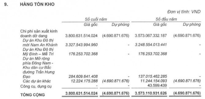 Đối với dự án Nam An Khánh, Sudico đang ghi nhận 3.327 tỷ đồng giá trị xây dựng dở dang tại dự án này, chiếm gần một nửa tài sản của công ty. Ngoài ra, tồn kho tại hai dự án KĐT Mỹ Đình và dự án mở rộng KDC bắc đường Trần Hưng Đạo cùng một số dự án khác là 473 tỷ đồng.