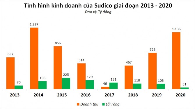Năm 2020, Sudico ghi nhận doanh thu 1.136 tỷ đồng, tăng trưởng 55% so với năm trước đó. Tuy nhiên lãi ròng doanh nghiệp chỉ đạt 31 tỷ đồng, giảm mạnh so với con số lãi 105 tỷ đồng năm 2019.